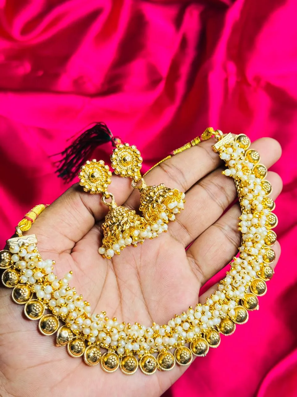 Be the first to review “Heavy Gold-Plated Choker and Jhumka Set with Pearl and Ball Work” Cancel reply