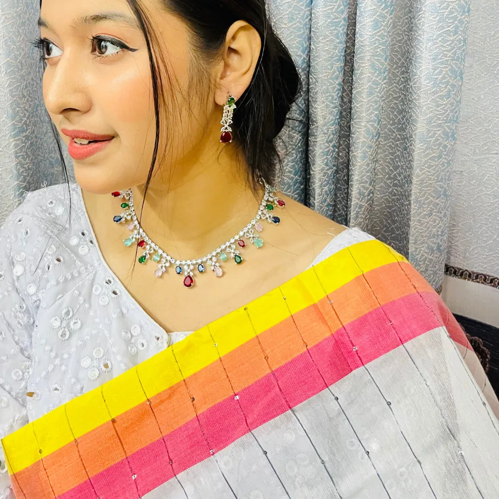 ডিজাইন: এই নেকলেসটিতে রুবি রেড, এমেরাল্ড গ্রিন, স্যাফায়ার ব্লু এবং ব্লাশ পিঙ্ক রঙের বিভিন্ন টিয়ার-ড্রপ আকৃতির পাথর ব্যবহার করা হয়েছে। হারের নিচে ঝুলে থাকা রঙিন ড্রপলেটগুলো একে একটি উৎসবমুখর লুক দেয়।
